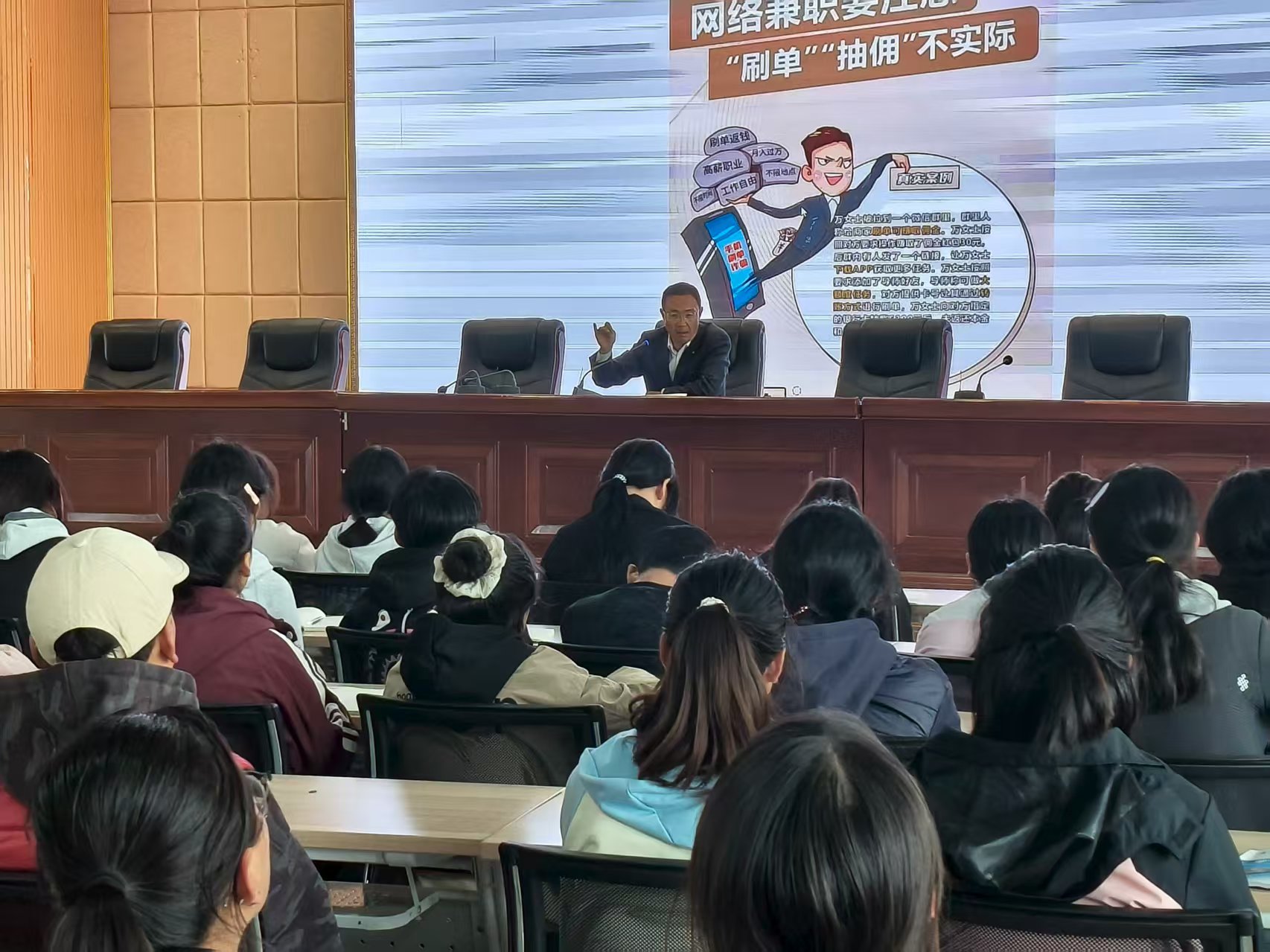 随后各科室的负责人就学籍管理、人才培养方案、学分设置、学分计算与学期安排、实践教学、课程修读等方面要注意的事项、学生日常管理制度要求、心理健康和党团知识、第二课堂及社团活动、实验室和多媒体教室的使用的方面进行教育宣讲,引导同学们遵守规章制度,提高安全意识,积极参加校园活动,全面发展。同时,学校邀请法治副校长王立石分别从预防校园欺凌、电信诈骗、未成年保护法等方面通过案例分析、图片视频,让学生了解相关法律法规,增强自我保护意识。